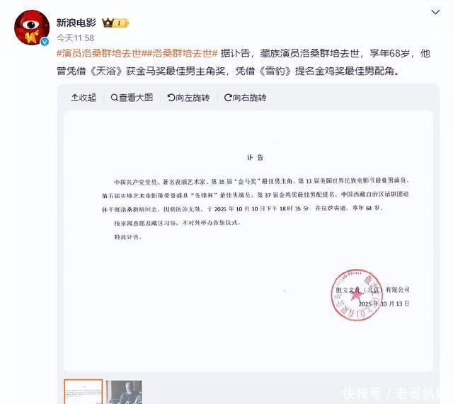 娱乐圈又传来噩耗!10日据傲立文化(北京)有限公司发布讣告中提到,中国共产党党员、著名表演艺术家、届“金马奖”最佳男主角、届美国世界民族电影节最佳男演员、第五届先锋艺术电影展荣誉盛典“先锋杯”最佳男演员、届金鸡奖最佳男配提名、中国西藏自治区话剧团退休干部洛桑群培同志,因病医治无效。日下分。在拉萨病逝,享岁。