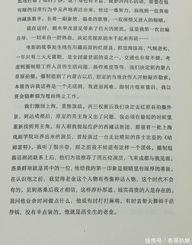 拍摄中,洛桑带来诸多灵感和惊喜,他的喜怒哀乐天然纯粹。他像戏里的老金一样勤劳,扛器材、抽烟的姿势似西部牛仔,获“万宝路”外号。在川藏高原自在的他到上海却病倒,越发沉默消瘦,仍任劳任怨。